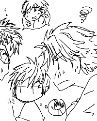 ラギ→マコ←コウ+ナギ→アスカ。 適当に描いたらこんな感じになってました…。(爆 どうやってマコっちゃんを落とすか会議中の二人に 参加してるようで別のことを考えてるナギ。 そのうちラギーとコーちゃんが喧嘩しだすんだね…! 月詠大好きだ…!!